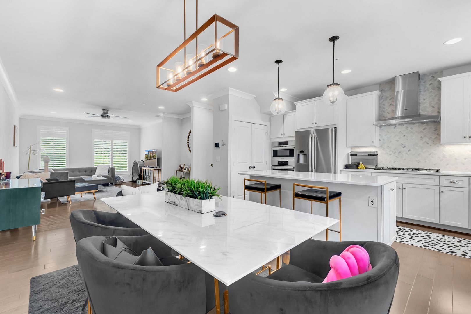 • Main Level: Bright, open-concept kitchen with a gorgeous tile backsplash and an oversized island, ideal for cooking or entertaining. Flows seamlessly into the dining area, light-filled living room, and a large back deck for outdoor relaxation.